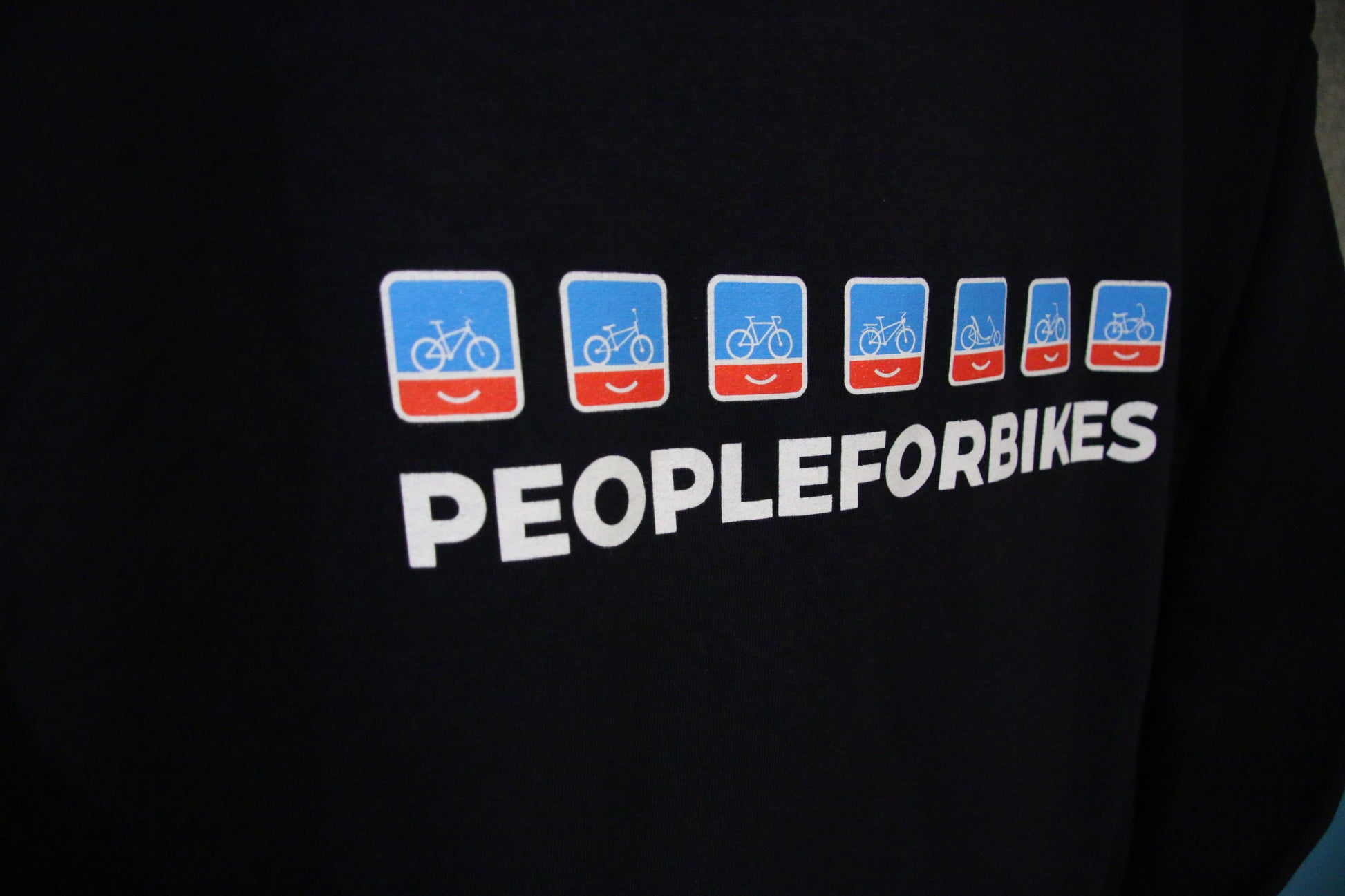 Our classic PeopleForBikes hoodie features seven different iterations of our "smiling bike" icon in different bike categories.