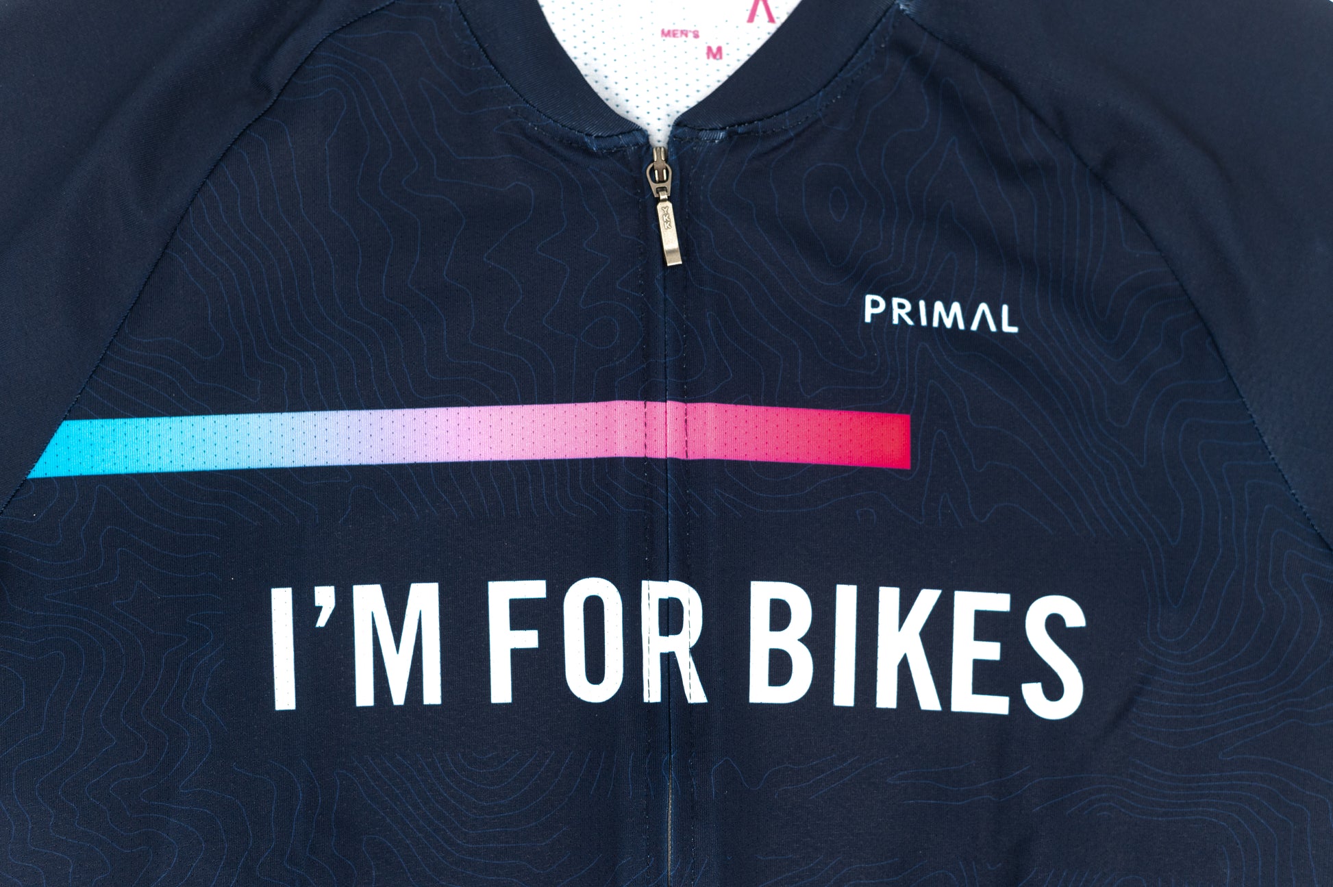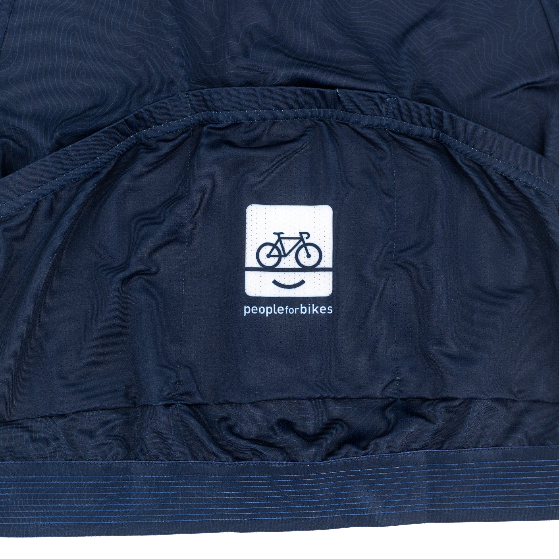 It’s time to retire that old jersey from a race you did 10 years ago with PeopleForBikes’ bike jersey from Primal. The lightweight, breathable fabric of the jersey provides unrivaled cooling and moisture wicking and will keep you feeling good and looking better no matter how long you’re in the saddle. This navy blue jersey with a light topographic print background features a prominent “I’m For Bikes” branding across the chest along with our signature smiling bike logo on the middle back pocket.